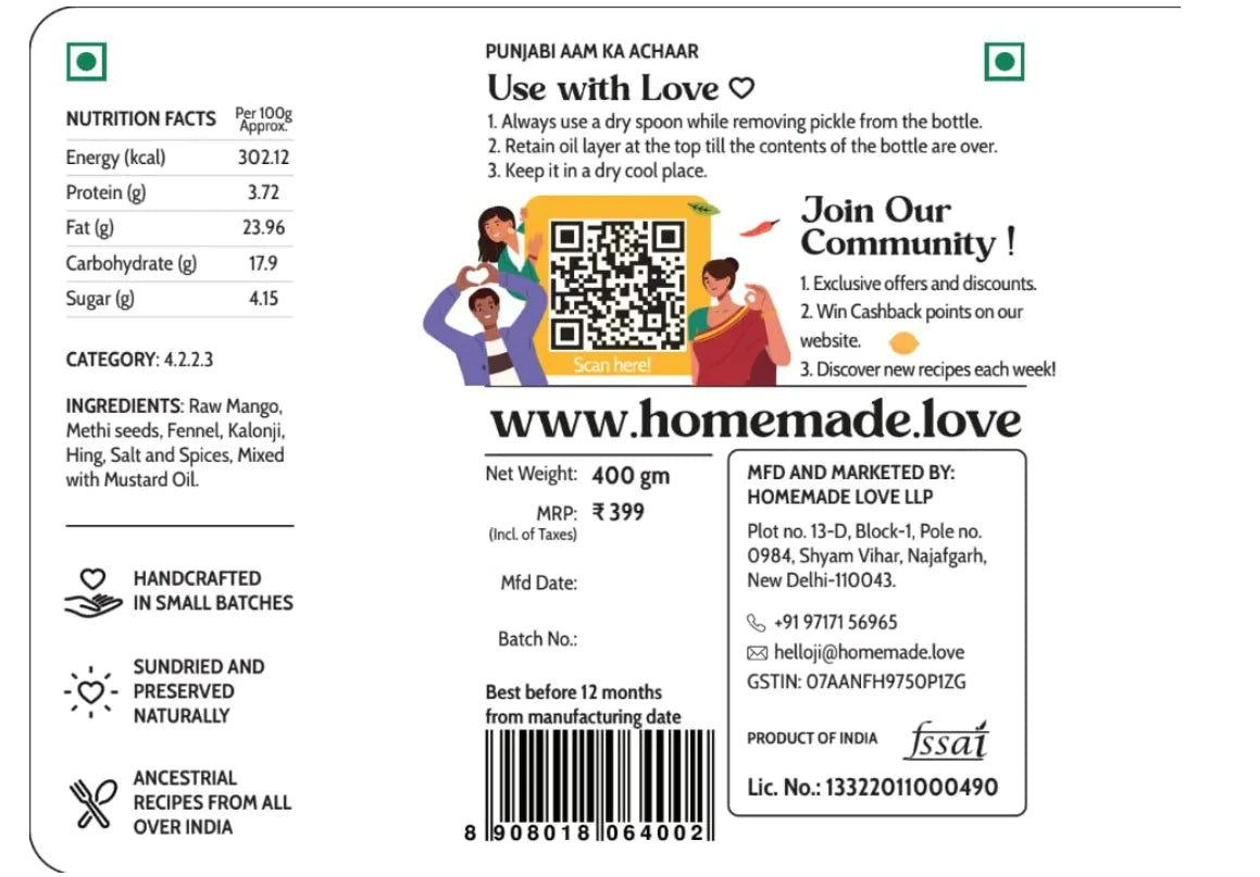 The Punjabi Mango Pickle comes packed in a 400gm and 200 gms jar. The 400gm jar is enough to last a family of four for about a month. Tighten the lid and make sure to keep the pickle in the fridge, so it tastes fresh every time you eat it. It's ok to keep it at room temperature. Try our Homemade Love Aam Chutney, and Garlic Pickle too