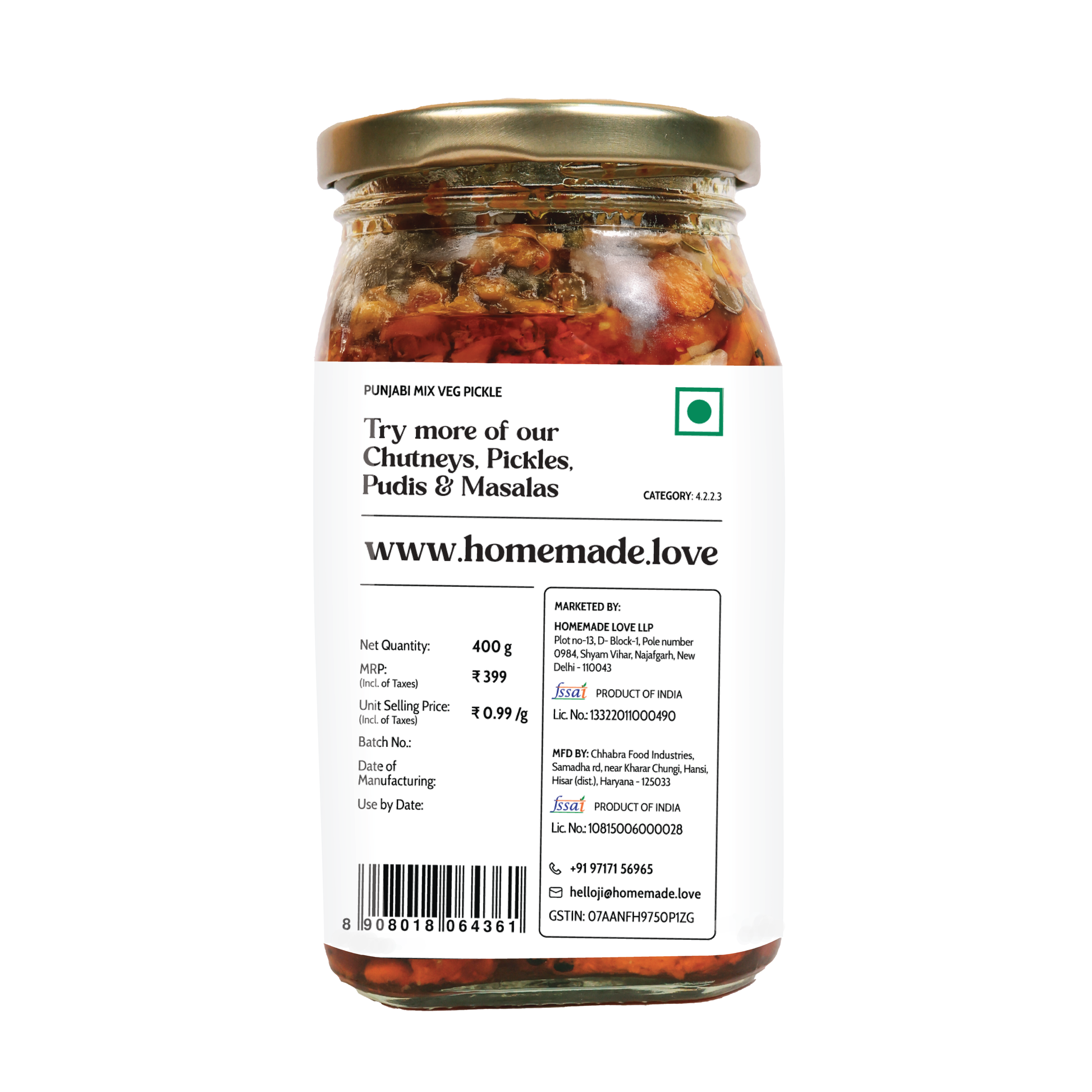 Experience the bold and vibrant flavors of Punjab with our Punjabi Mix Veg Pickle, a perfect blend of fresh seasonal vegetables, traditional Indian spices, and pure mustard oil. Crafted using an authentic Punjabi recipe, this pickle brings the true homemade taste of North India to your dining table.